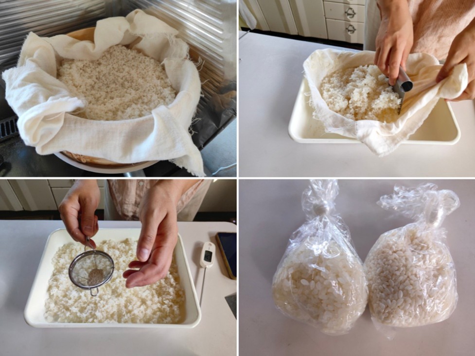 お話をうかがった日は、 麹を作る過程も見せていただきました! 蒸したお米に麹菌(種麹)をまぶし、 ビニール袋に入れて小分けに。 これを2日間ポケットに入れて保温・発酵させて麹を作る「ポケット麹」を教えていただき、 お土産にいただきました