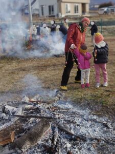 地域のどんど焼きにて。柳の枝に繭玉(お団子)を刺してあぶって食べます