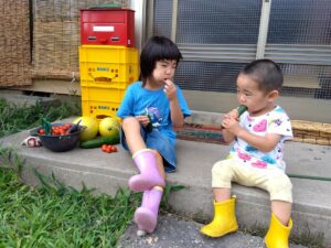 玄関先で採れたて野菜をもぐもぐ(左)。 帰宅後も、 玄関を出たらすぐ広いお庭でのびのび遊べる(右)