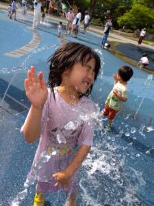 自然の中でのびのびと遊ぶお子様(左は東御市の遊びながら山を整備するイベントに参加した時の様子、 右は東御中央公園の噴水)